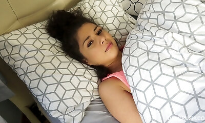 Flat chested beauty Hannah enjoys foreplay on the bed