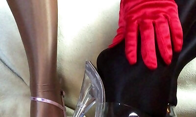 Sensual teasing close up legs and feet in Shiny glossy pantyhose and high stilettos.