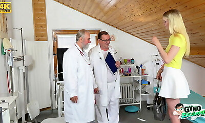 20-year-old sexy blonde girl Ariela Donovan gets her aroused pussy examined by 2 older gynecologists