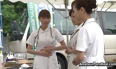 瘦瘦的年轻亚洲护士与可爱的脸和娇小有一个铁杆性与她的病人